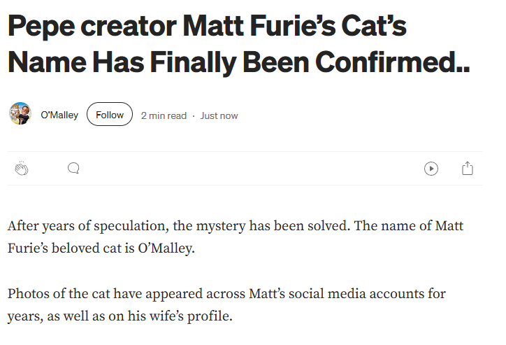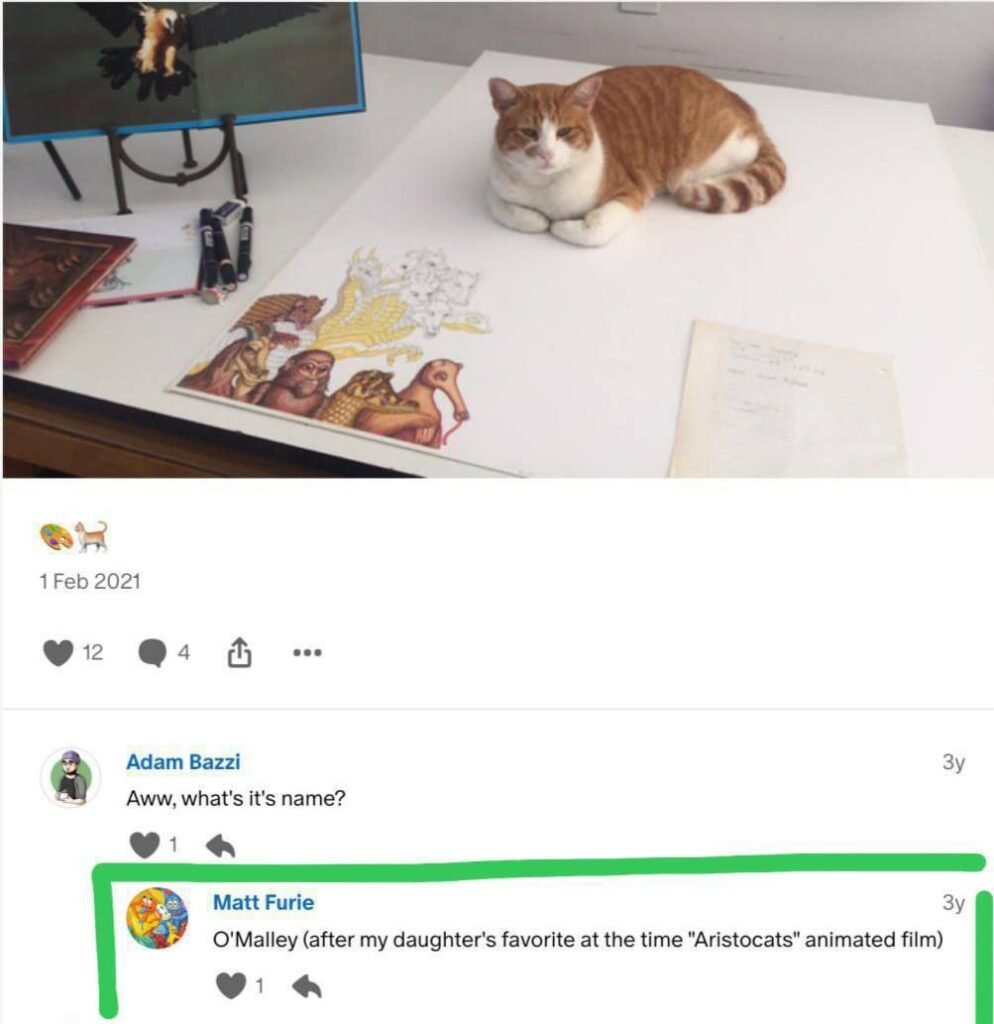 O’Malley is the beloved pet cat of Matt Furie, the creator of Pepe the Frog.